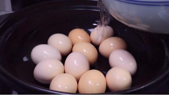 2、清洗乾淨的雞蛋,我們要給它加入到砂鍋中,然後往裡面加入適量的清水沒個雞蛋,並蓋上蓋子,給他煮上15分鐘。