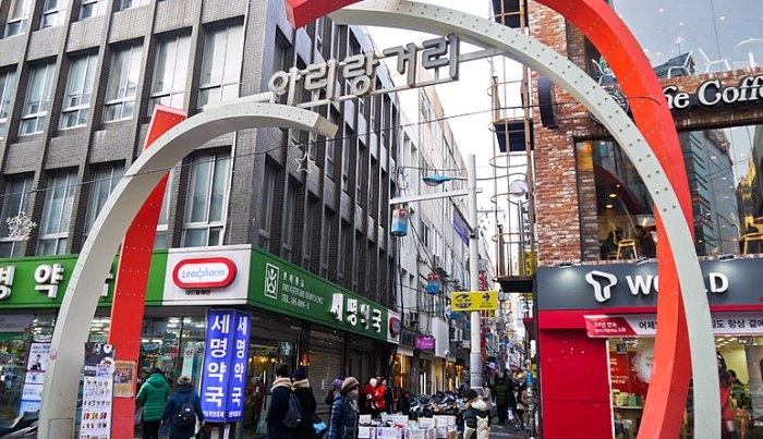 這裡更是南浦洞的購物、美食核心區!糖餅(호떡,熱熱甜甜的,冬天吃爆暖)攤位永遠排長龍。街道兩旁滿是服飾店、美妝店和小吃攤,人潮洶湧,充滿活力。想掃街吃小吃、買平價韓貨,這裡是好選擇。
