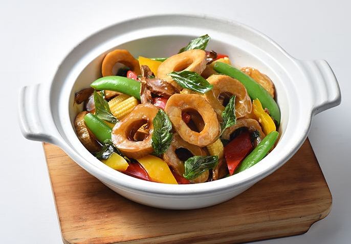 - 他們的炒青菜火候掌握得不錯,保有脆度。「糖醋吉丁」酸酸甜甜,口感Q彈,很像傳統糖醋肉!「三杯杏鮑菇」香氣十足,非常下飯。